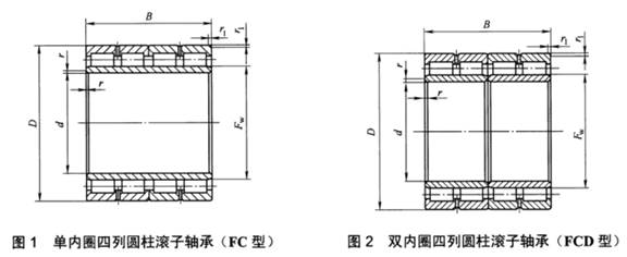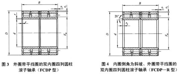 符号含义与应用 FC—四列圆柱滚子轴承(一个内圈) FCDP—外圈单挡边,带平挡圈的双内圈四列圆柱滚子轴承 FCD—双内圈四列圆柱滚子轴承 能承受大的径向载荷,不能承受轴向载荷,不能限制轴向位移,刚性大,用于轧机等重型机械 |
