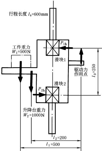 某机械的垂直导轨(图a)将工件从下面提起,运行到最高点卸下,下降时仅承受升降台自身的重力W2,类似于表直线运动系统常见受载情况的计算的情况1—— 计算Ph(两者不同处是表中为双导轨,本例为单导轨,故Ph值增大一倍) 上升时