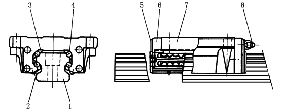 滚动直线导轨副结构组成 1—导轨;2—侧面密封垫;3—保持架;4—承载球列; 5—末端密封垫;6—侧面平板;7—滑块;8—润滑油接口 滚动直线导轨副结构组成如上图所示。按滚珠在导轨副中的分布与接触情况,滚动直线导轨副的类型、结构、特性与用途见表滚动直线导轨副主要类型及参数 |