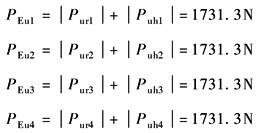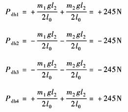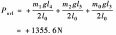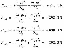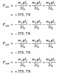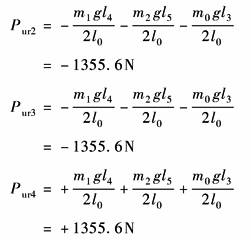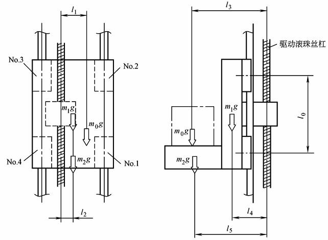 某立式滚动导轨副选用GGB25AB2P12×1500-4(四滚道,公称尺寸25,AB型,2根导轨,F1中预加载荷,2个滑块,导轨长1500mm,4级精度)。由表四滚道型滚动直线导轨副结构尺寸及载荷特性,基本额定动载荷C=17.7kN,基本额定静载荷C0=22.6kN,受载简图如下图1所示。相当于表直线运动系统常见受载情况的计算的情况1,由三个不同的mg进行叠加计算求出每个滑块的载荷 图1中,距离l0=300mm,l1=80mm,l2=50mm,l3=280mm,l4=150mm,l5=250mm,行程l=1000mm,质量m0=100kg,m1=200kg,m2=100kg 仅上升时装载质量m0,下降时不装载。重力加速度g=9.8m/s2 (1)滑块载荷大小的计算 1)上升时 ①滑块的径向载荷大小Purn