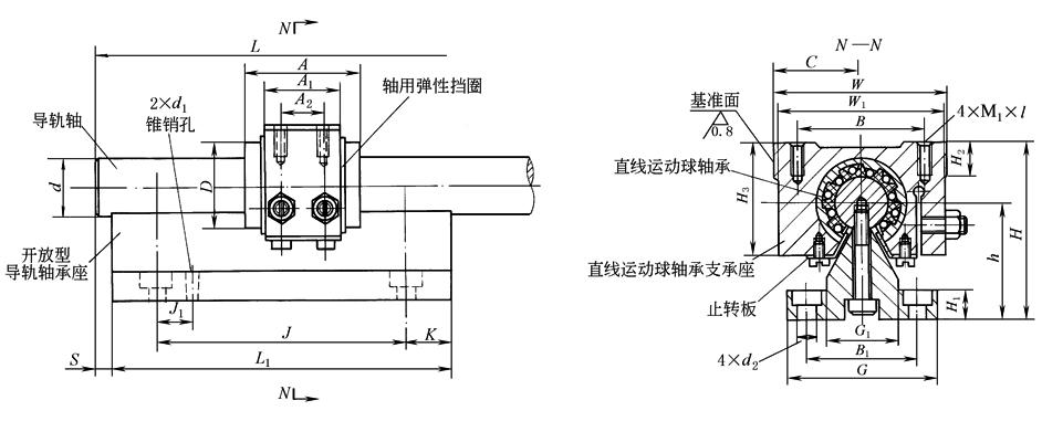注:1.4×d2 孔配用内六角螺钉紧固。 2.S 尺寸由客户自定,请于订货时注明。 3.开放型导轨轴支承座有特殊要求者可特殊订货。 4.特殊系列外形尺寸除所列尺寸外,其他尺寸系列与通用系列对应规格所列尺寸相同。 5.生产厂:南京工艺装备厂。 |