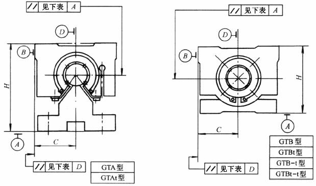 注:1.表中所列精度等级 GTA 型在导轨轴支承座位置上检测,GTB 型靠近导轨轴两端支承座位置检测。 2.各项目的检测,必须在基面 B、A 相互垂直的情况下进行。 3.在同一平面上并列使用二套滚动直线导套副时,C 的尺寸公差和两者一致性只适用基准滚动直线导套副。 4.直线运动球轴承内切圆与导轨轴、直线运动球轴承安装外圆与支承座孔间的配合分别为 g6、H7。 |