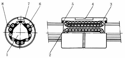 1—花键轴;2—保持架;3—花键套;4—键槽;5—橡胶�っ芊獾妫� 6—退出滚珠列;7—承载滚珠列;8—油孔 滚珠、花键套、循环装置与密封装置是组装成一体的,可以自由地从花键轴上卸下,滚珠及花键套上的其他零件均不会散落。结构紧凑,组装简单 由于滚珠与花键套和花键轴滚道的接触角为45°,因此既能承受径向载荷,又能传递转矩 通过选配滚珠的直径,使滚动花键副内产生过盈,即预加载荷,可以提高接触刚度、运动精 度和抗冲击的能力。滚动花键副可用于高速运动的场合,运动速度可达100m/min以上 滚动花键副已广泛用于机械人及摇臂、自动装卸车、组合机床、自动搬运装置、轮胎成形机、点焊机主轴、高速自动涂装机导轴、铆接机、卷绕机、电弧加工机摇盘、磨床主轴驱动轴、各种变速装置、精密分度轴以及各种机床主轴、各类测量仪器及自动绘图仪的精密导向轴、线切割机等多种机械设备中 |