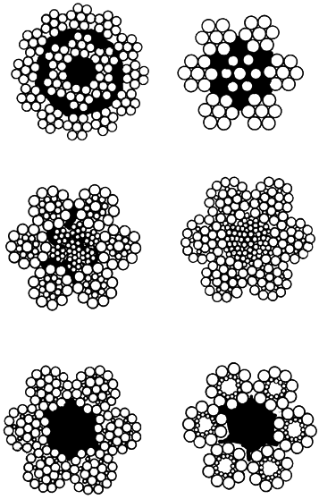 (一个)天然纤维芯的多股绳(两层圆股) 全称:12(6+1)+6(6+1)+NF 简称:18×7+NF 金属股芯钢绳 全称:6(6+1)+IWS(6+1) 简称:6×7+IWS 金属绳芯西鲁钢绳 全称:6(10+10+1)+ IWR[6(6+1)+ IWS(6+1)] 简称:6×21S+IWR 金属绳芯填充钢丝绳 全称:6(12+6F+6+1) +IWR[6(6+1) +IWS(6+1)] 简称:6×19Fi+IWR 天然纤维芯瓦林吞钢丝绳 全称:6(6/6+6+1)+NF 简称:6×19W+NF 天然纤维芯三角股钢丝绳 全称:6V(9+12+1V)+NF 简称:6V×22+NF |