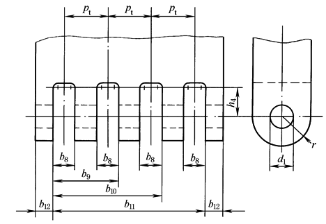 1)形状和尺寸:与板式链配用的端接头的形状和尺寸见表1、表2及图 2)端接头和销轴的强度:端接头和用以连接板式链的销轴应具有不低于板式链的极限拉伸载荷的强度 3)长度调整:多挂板式链并列使用时,端接头连接装置的调整长度不小于一个链节距