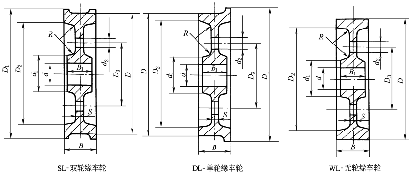 标记示例: a.直径D=710mm,轮宽B=155mm的双轮缘车轮,标记为:车轮 SL-710×155 JB/T 6392.1 b.直径D=315mm,轮宽B=110mm的单轮缘车轮,标记为:车轮 DL-315×110 JB/T 6392.1 c.直径D=630mm,轮宽B=145mm的无轮缘车轮,标记为:车轮 WL-630×145 JB/T 6392.1 表1 |