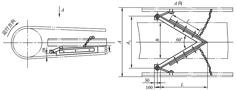 空段清扫器装设于尾部改向滚筒前和垂直拉紧装置第一个90°改向滚筒前,用以清除落到输送带下分支非工作面上的杂物,保护改向滚筒和输送带