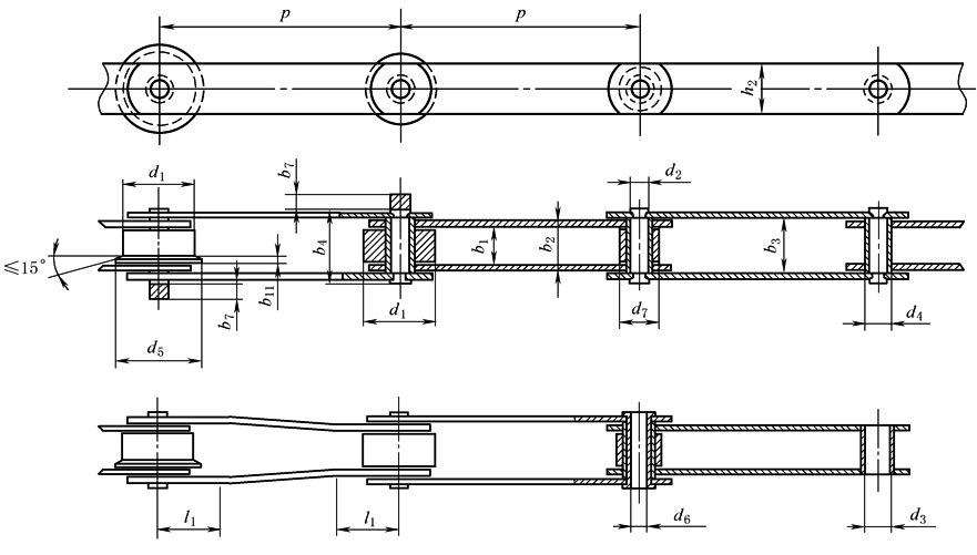 注:1.节距p是理论参考尺寸,用来计算链长和链轮尺寸,而不是用作检验链节的尺寸。 2.用×表示的链条节距规格仅用于套筒链条和小滚子链条。 3.阴影区内的节距规格是优选节距规格。 4.弯板链节尺寸l1决定最大链板长度和对铰链轨迹的最小限制。 |