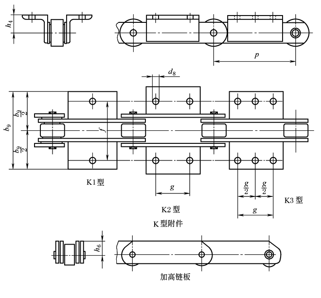 (2)附件 K型附件分为K1型、K2型、K3型三种,可由角钢制造或钢板弯曲而成,也可与链板制成一个整体。附件可在链条的一侧或两侧。链板还可以制成加高链板 K型附件及加高链板安装尺寸如下