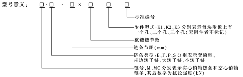 标记示例: 1.链号M80、带边滚子链、链条节距100mm、整链链节为80节、K1型附件的输送链,标记为: M80-F-100×80K1 GB/T 8350—2008 2.链号MC224、小滚子链、链条节距200mm、整链链节数为60节,K2型附件的输送链,标记为: MC224-S-200×60K2 GB/T 8350—2008 |
