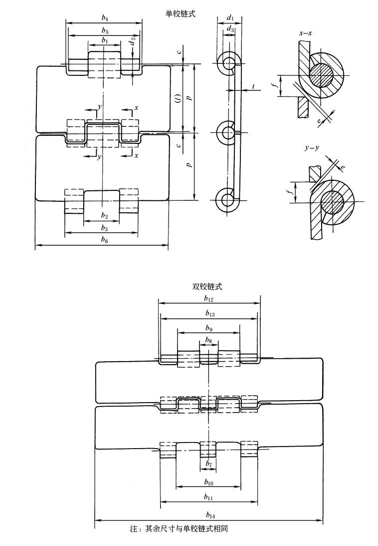 注:1.平顶链链号中C后面的数字是表示链板宽度的代号,它乘以25.4/4mm等于链板宽度的公称尺寸。字母S表示单铰链,D表示双铰链。 2.节距p是一个理论计算尺寸,不适用于检验链节的尺寸。 3.链板长(l)为参考值。 4.一级耐蚀钢和二级耐蚀钢的划分,仅与耐蚀钢相应的抗拉强度有关,有关钢的耐腐蚀性能详情,请向制造厂咨询。 |