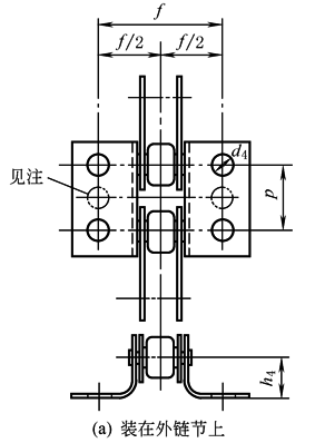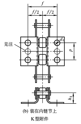 注:1.每个K2型附件有两个附件孔,K1型附件除中央有一个孔外,其余与K2型附件相同。 2.附件也可以仅设置在单侧(本条是根据国情及考虑实际使用情况后增加的)。 有两种附件型式,即K1型和K2型。附件板的实际形状由制造厂确定,附件一般与链板做成一体,即由链板延伸部分弯成水平翼板。附件板的长度由制造厂确定,但必须适应K2型开设附件孔的要求,同时在工作时,不应与相邻链节发生干涉,通常采用K1型和K2型通用附件板长度 型号意义: