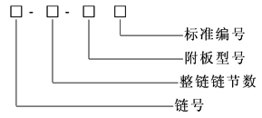 标记示例: 链号为08A、87节、附板为K1型的滚子链,标记为: 08A-87-K1 GB/T 1243—2006 |