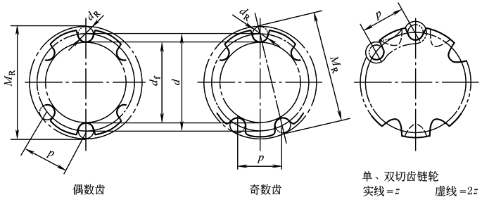 注:1.双节距链的链轮可做成单切齿或双切齿。单切齿(图中实线所示)链轮的有效齿数等于实际齿数(z=z1);双切齿(图中虚线所示)则是在单切齿链轮的各齿中间位置上又切出一组齿,在这种情况下,链轮的有效齿数等于实际齿数之半(z=1/2z1)。 2.单切齿链轮的齿数z必为整数。双切齿链轮的实际齿数z1是整数,但z1为奇数时,有效齿数z则成为分数。 3.双节距链的双切齿链轮不能与短节距滚子链配用,反之,短节距滚子链的链轮也不能与双节距链配用。 |