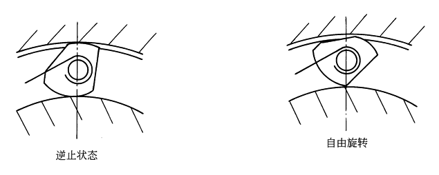 在逆止器内部,有多个异形块分布在由内、外圈所形成的滚道中,当内圈正向运转时,带动异形块一起旋转,当转速超过非接触转速时,异形块在离心力的作用下发生偏转,与内、外圈脱离接触,从而实现无磨损运转。当内圈反向运转时,在弹簧力的作用下,异形块与内、外圈接触并将其楔紧成一体,承受由内圈传送来的反向力矩,见下图