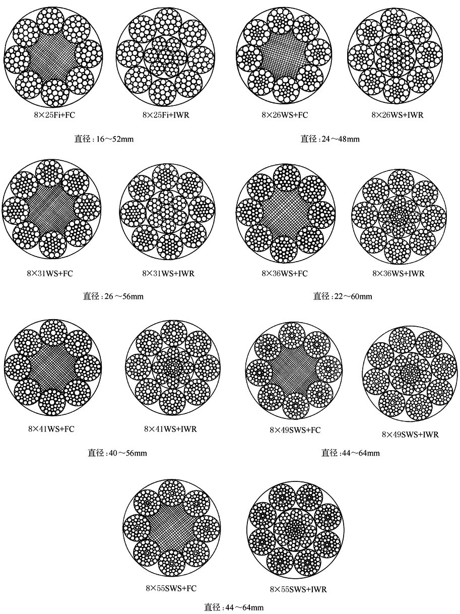 力学性能 钢丝绳结构:8×25Fi+FC 8×25Fi+IWR 8×26WS+FC 8×26WS+IWR 8×31WS+FC 8×31WS+IWR 8×36WS+FC 8×36WS+IWR 8×41WS+FC 8×41WS+IWR 8×49SWS+FC 8×49SWS+IWR 8×55SWS+FC 8×55SWS+IWR |