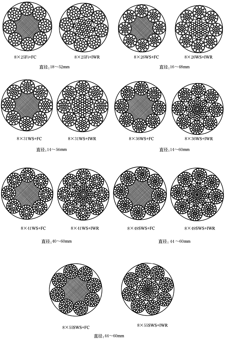 力学性能 第6组和第7组 8×19类和8×37类 钢丝绳结构:8×25Fi+FC 8×25Fi+IWR 8×26WS+FC 8×26WS+IWR 8×31WS+FC 8×31WS+IWR 8×36WS+FC 8×36WS+IWR 8×41WS+FC 8×41WS+IWR 8×49SWS+FC 8×49SWS+IWR 8×55SWS+FC 8×55SWS+IWR |