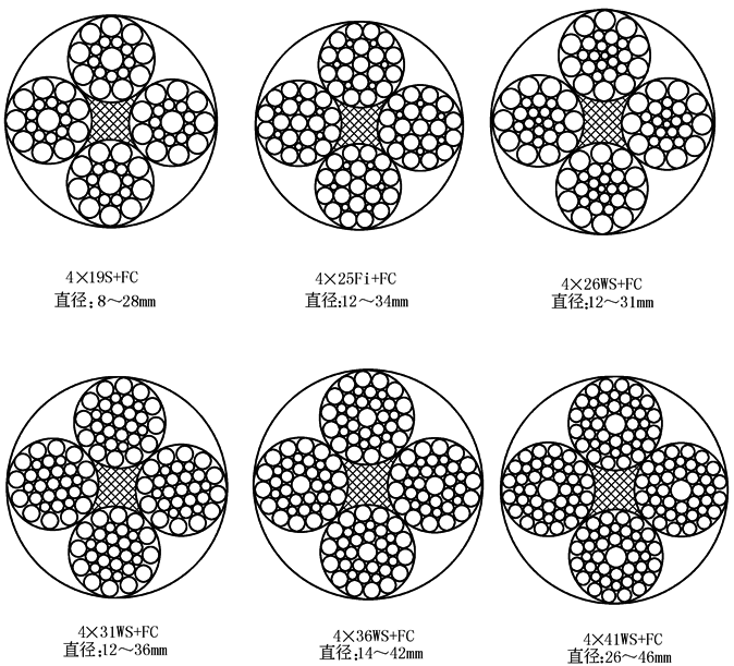 力学性能 钢丝绳结构:4×19S+FC 4×25Fi+FC 4×26WS+FC 4×31WS+FC 4×36WS+FC 4×41WS+FC |