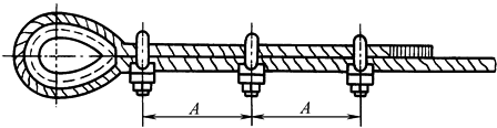 (3)钢丝绳夹间的距离 钢丝绳夹间的距离A等于6~7倍钢丝绳直径 (4)绳夹固定处的强度 按上述固定方法正确布置和夹紧,固定处的强度至少为钢丝绳自身强度的80% (5)钢丝绳夹的紧固方法 紧固绳夹时必须考虑每个绳夹的合理受力,离套环最远处的绳夹不得首先单独紧固。离套环最近处的绳夹(第一个绳夹)应尽可能地靠紧套环,但仍必须保证绳夹的正确拧紧,不得损坏钢丝绳的外层钢丝 |