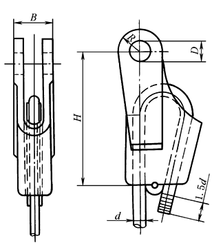 注:1.本标准适用于各类起重机上使用的符合GB 8918—2006、GB/T 20118—2006的圆股钢丝绳的绳端固定或连接。 2.表中许用载荷和断裂载荷是楔套材料采用GB/T 11352—1989中规定的ZG270-500铸钢件、楔的材料采用GB/T 9439—1988中规定的HT200灰铸铁件确定的。 3.楔形接头与钢丝绳的连接方法如表头图所示。 |
