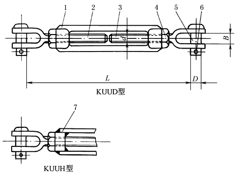 1—模锻螺旋套;2—U形左螺杆;3—U形右螺杆;4—锁紧螺母;5—光直销;6—开口销;7—焊接螺旋套