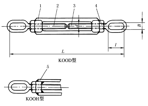 1—模锻螺旋套;2—O形左螺杆;3—O形右螺杆;4—锁紧螺母;5—焊接螺旋套 KUUD型、KUUH型、KOOD型和KOOH型螺旋扣的基本尺寸 mm |