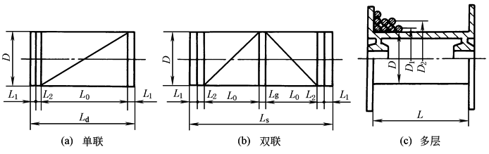 见下图 L0——卷筒有螺纹槽部分长度 L1——无绳槽的卷筒端部尺寸,按需要定 L2——固定绳尾所需长度,L2≈3P Lg——中间光滑部分长度,根据钢丝绳允许偏斜角确定 Hmax——最大起升高度 m——滑轮组倍率 Z1——钢丝绳安全圈数,Z1≥1.5~3 P——绳槽节距或绳索卷绕的螺旋节距 D1,D2,D3…Dn——各层直径 Z——每层圈数 n——卷绕层数 l——卷筒总卷绳长度,l=Hmaxm |