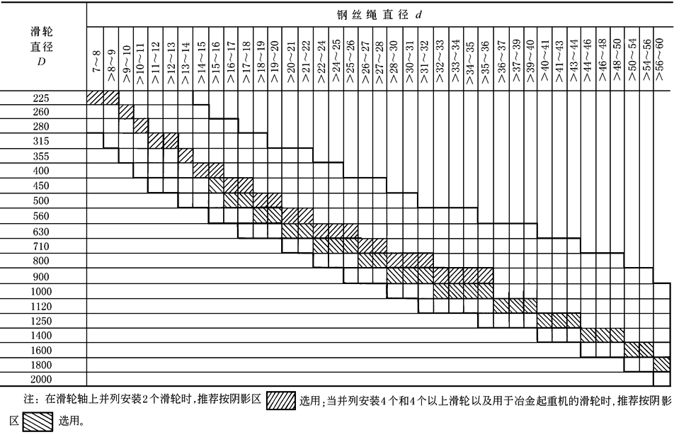 本标准规定了滑轮直径与钢丝绳直径的匹配关系。表中以黑框线包络的区域为最常使用的匹配范围