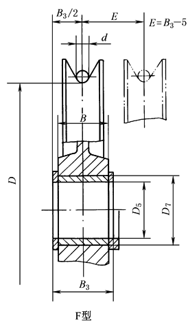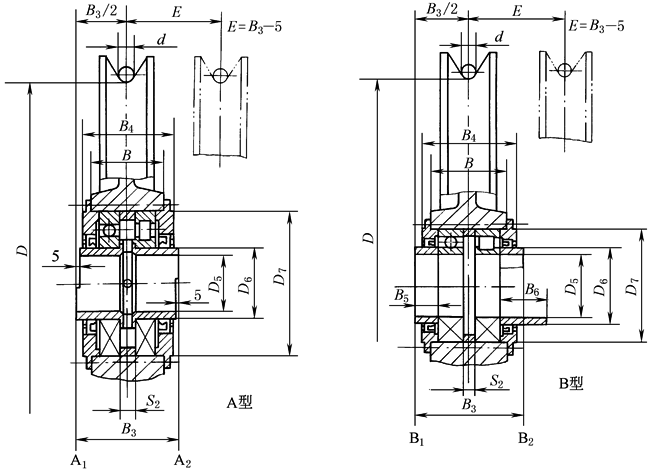 A 型——带滚动轴承(严密密封),有内轴套 B 型——带滚动轴承(严密密封),无内轴套 F 型——带滑动轴承 A1、B1为深沟球轴承;A2、B2为圆柱滚子轴承 注:A 至 D 型及 F 型滑轮的 B3 尺寸不给间隙,但为了安装,在连接结构中每侧的轴向间隙至少留1mm 标记示例: 钢丝绳直径 d=25mm,滑轮直径 D=630mm 和滑轮轴的直径 D5=90mm 的 A 型滑轮,标记为: 滑轮 A25×630-90 JB/T 9005.3—1999 型号意义:
