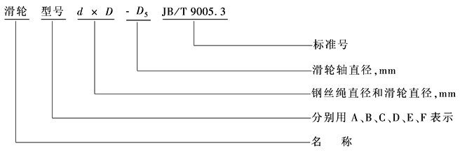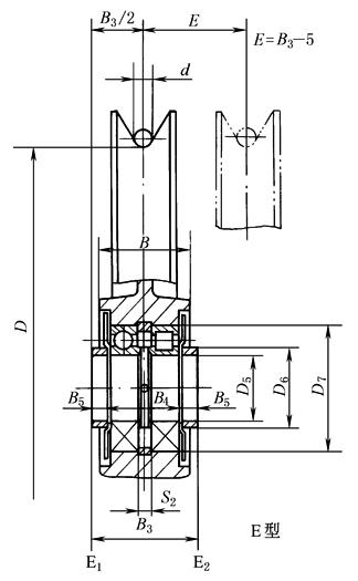 E 型——带滚动轴承(一般密封)无内轴套 E1为深沟球轴承;E2为圆柱滚子轴承 标记示例: 钢丝绳直径 d=25mm,滑轮直径 D=630mm 和滑轮轴的直径 D5=90mm 的 A 型滑轮,标记为: 滑轮 A25×630-90 JB/T 9005.3—1999 型号意义: